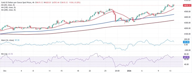 周三(1月14日)亚市尾盘,现货黄金价格突然加速上涨,金价刚刚触及4639.55美元/盎司,创下历史新高,金价日内暴涨52美元。FXStreet首席分析师Valeria Bednarik撰文,对黄金技术前景进行分析。